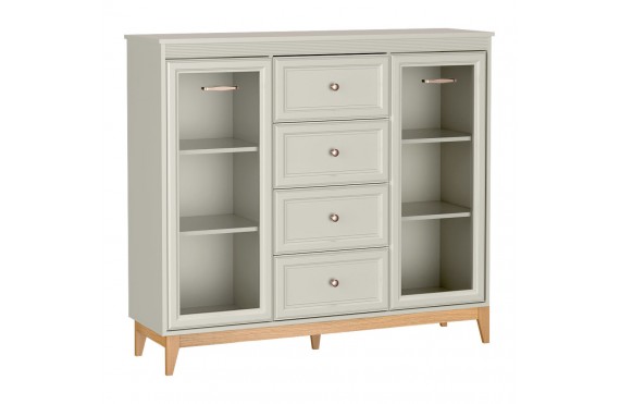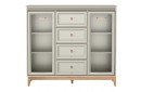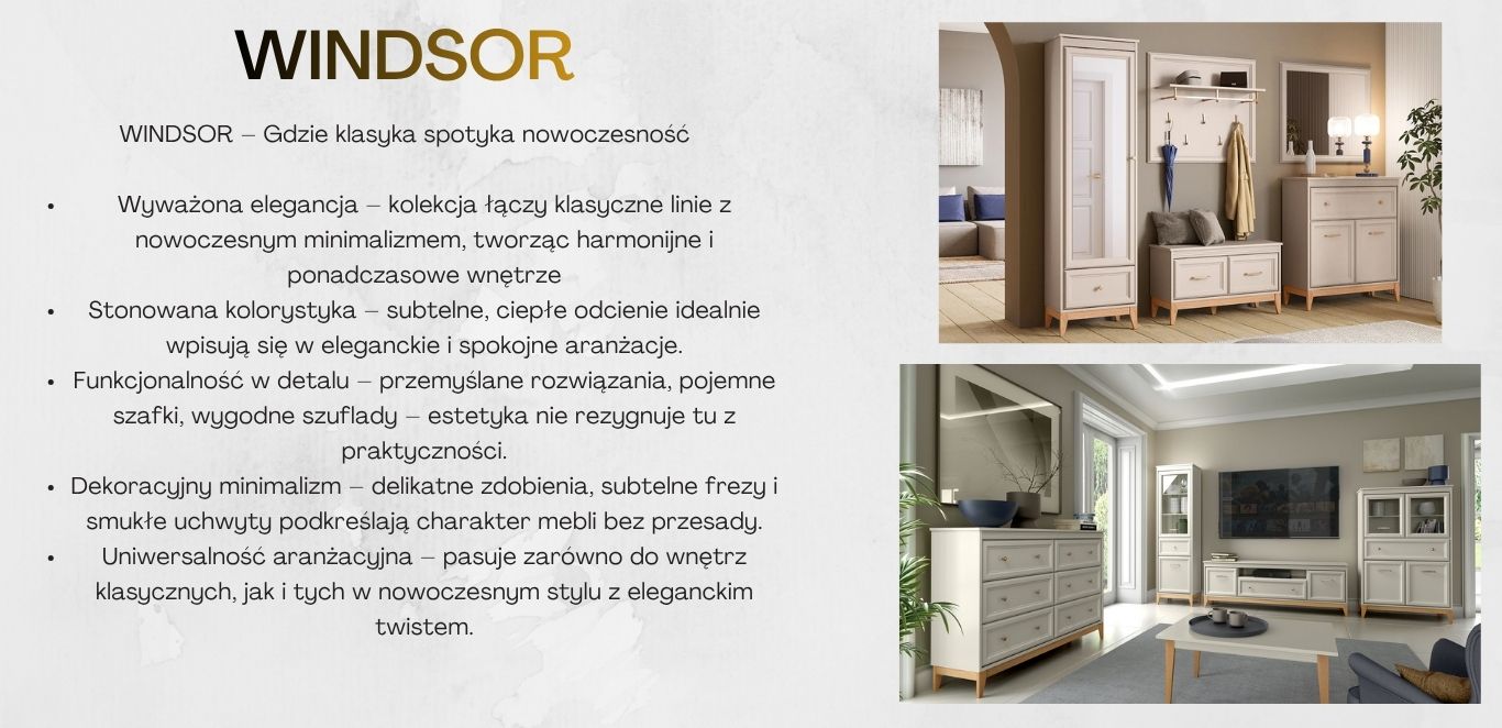 WINDSOR – 7 to elegancka i funkcjonalna witryna, która łączy klasyczną estetykę z nowoczesnymi rozwiązaniami. Jej subtelna kolorystyka w odcieniu kaszmiru, zestawiona z drewnianymi akcentami, tworzy harmonijną i przytulną atmosferę w każdym wnętrzu. Dzięki przemyślanemu układowi oraz wysokiej jakości wykonaniu, witryna doskonale sprawdzi się w salonie, jadalni czy gabinecie, pełniąc zarówno funkcję dekoracyjną, jak i praktyczną.