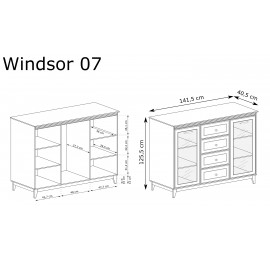 Obszerne przeszklenia eksponują ulubione dodatki, natomiast pojemne szuflady pozwalają na uporządkowanie najpotrzebniejszych przedmiotów. Subtelne uchwyty w złotym odcieniu dodają całości eleganckiego charakteru, podkreślając wyjątkowy styl kolekcji WINDSOR. Zastosowany system cichego domyku sprawia, że korzystanie z mebla jest niezwykle komfortowe – szuflady i drzwiczki zamykają się płynnie i bezgłośnie. Witryna WINDSOR – 7 to doskonałe połączenie funkcjonalności i estetyki, które sprawdzi się w wielu aranżacjach. Jej wyjątkowy wygląd i solidne wykonanie czynią ją meblem na lata, dodającym wnętrzu stylu i elegancji.